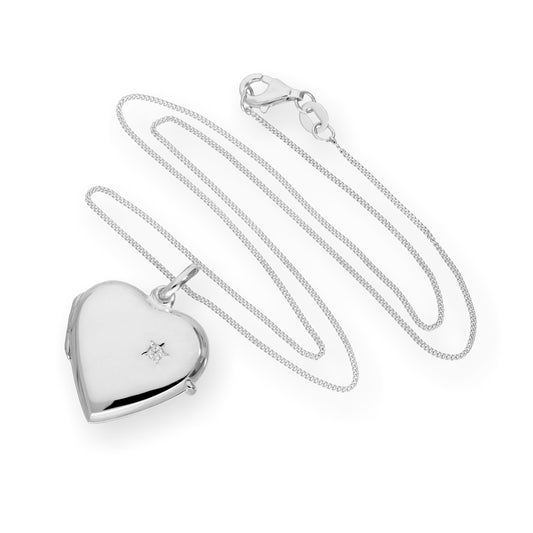 Small Sterling Silver Heart Locket with Diamond on Chain 16 - 24 Inches