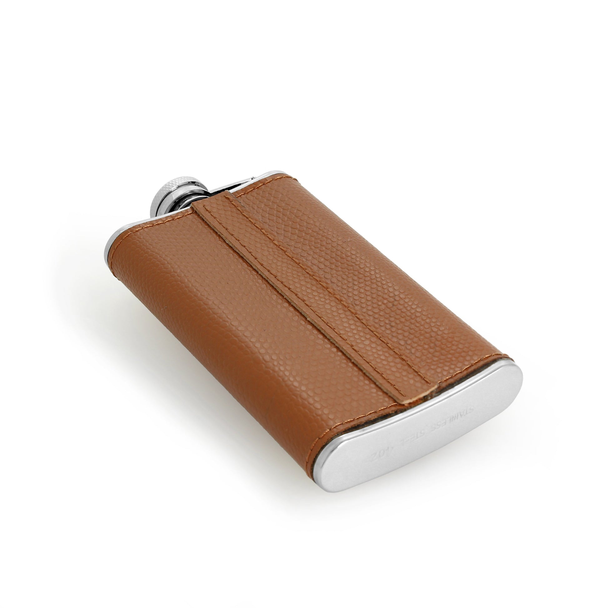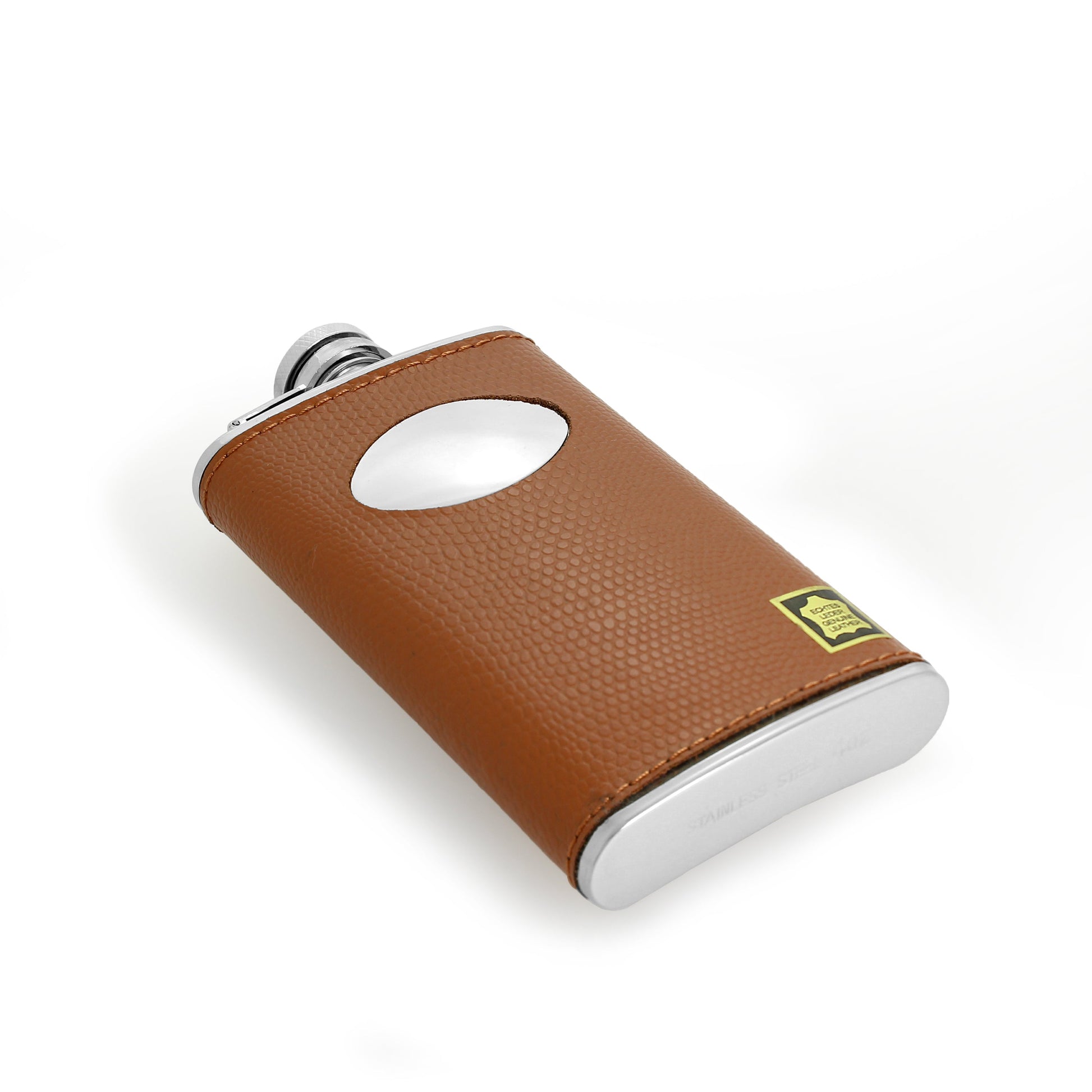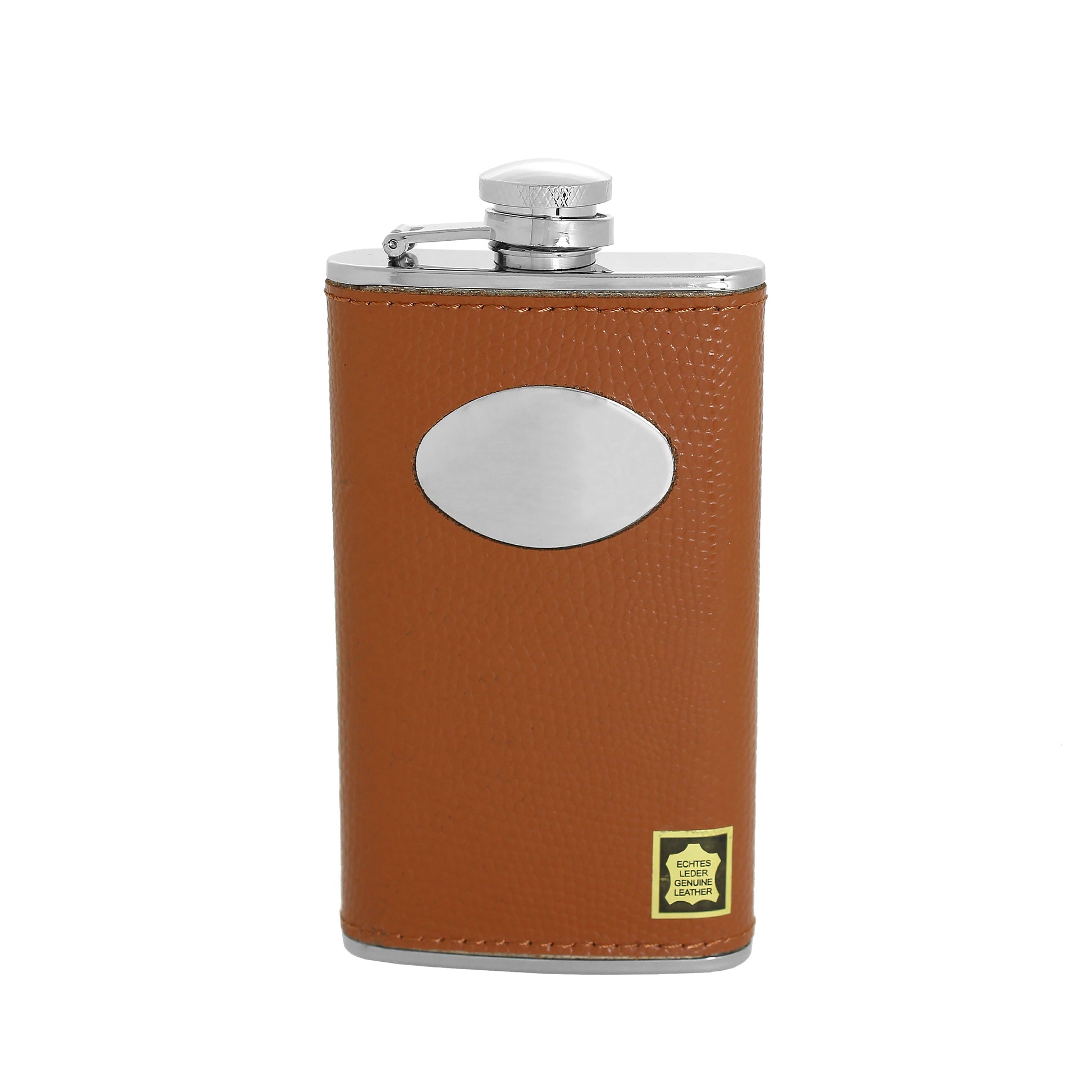 4oz Stainless Steel & Genuine Tan Leather Engravable Hip Flask w Funnel