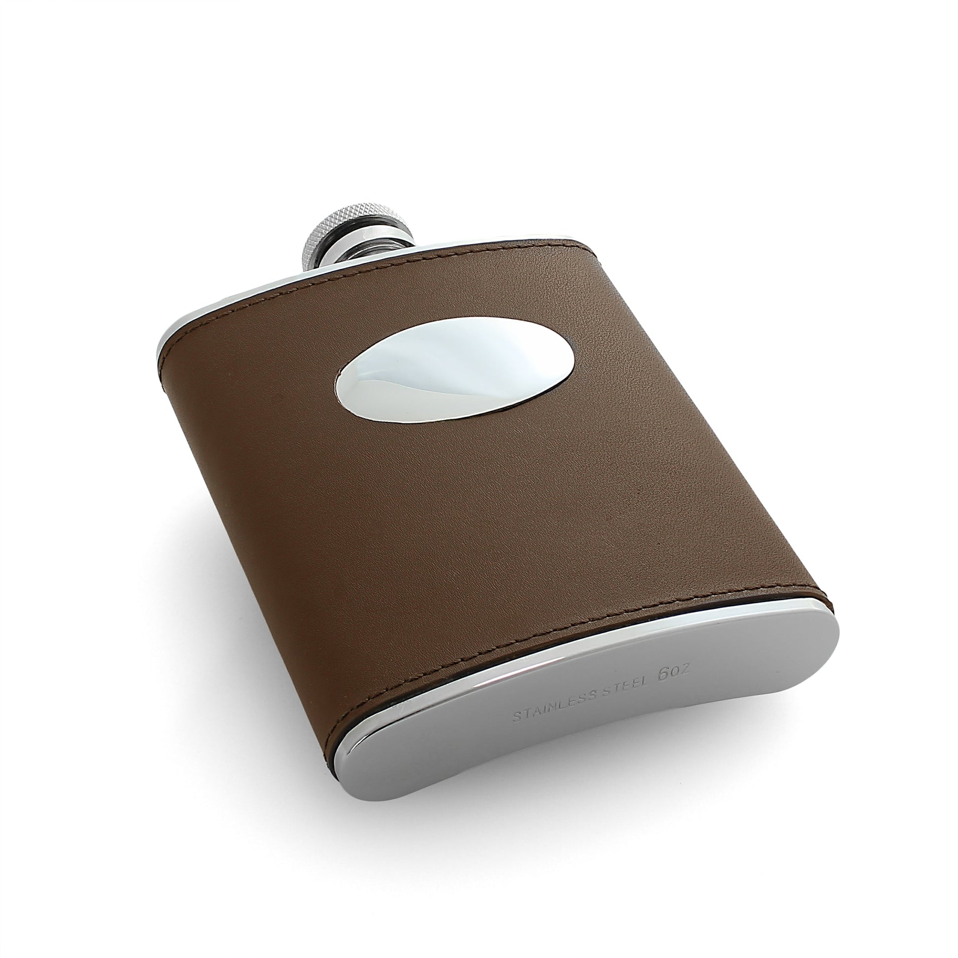 6oz Stainless Steel & Brown Leather Hip Flask with Engraving Plate