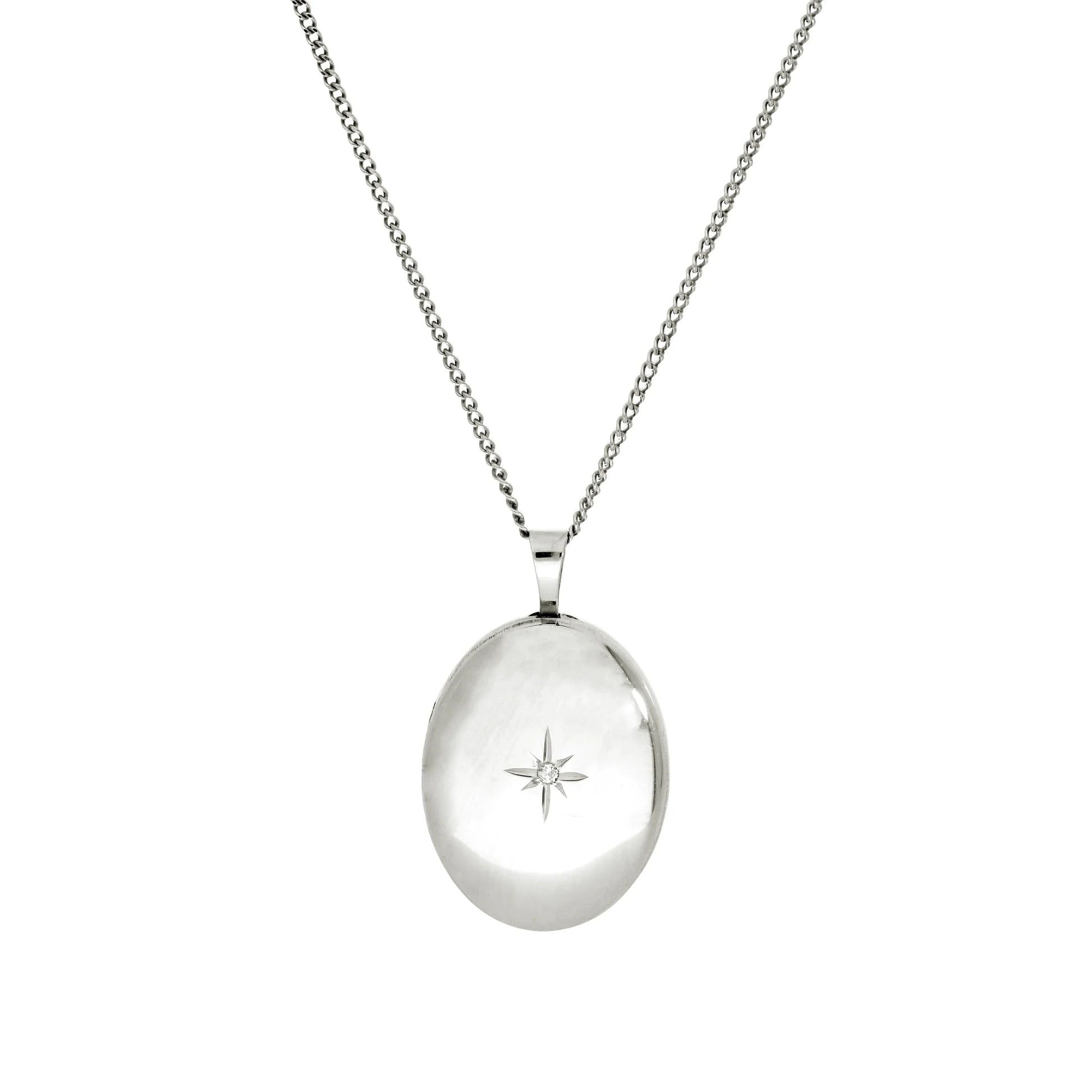 9ct White Gold & Diamond Oval Locket with Shining Star Design 16 - 18 Inches