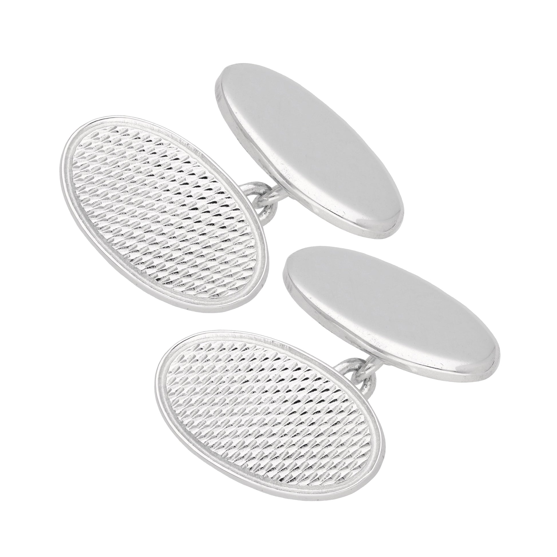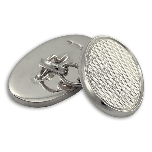 These sophisticated sterling silver cufflinks feature a stylish engine-turned textured finish in a classic oval shape. Each one measures 1.9cm by 1.2cm and can be engraved on the reverse with up to 10 characters of a special date or name. They fasten with a chain link and will arrive in their own elegant hinged display box, ready to go.